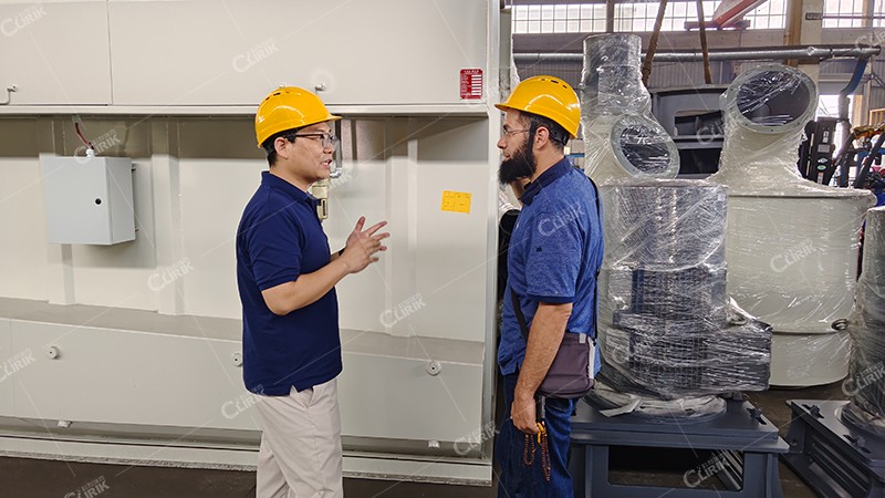 展厅参观之后,朱经理又带领客户来到我们的磨粉机生产车间,以磨辊和磨环为例,向客户详细介绍了超细磨粉机的易损件都有哪些,以及易损件的保养维护方法和使用技巧是什么。